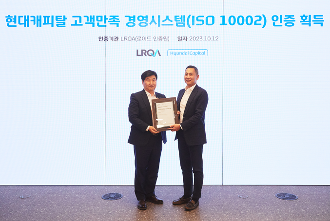 [현대캐피탈 사진 제공: 이일형 LRQA Korea 대표이사(왼쪽), 목인원 현대캐피탈 대표 (오른쪽)]